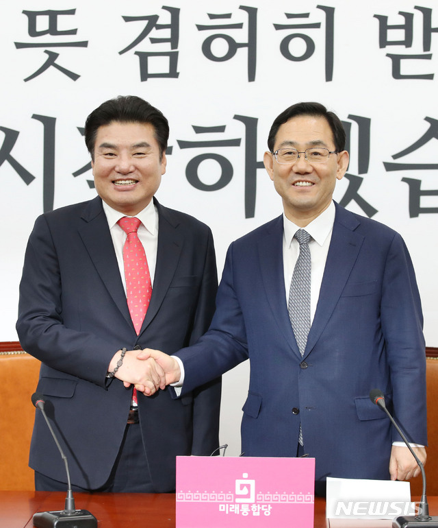 [서울=뉴시스] 김진아 기자 = 주호영(오른쪽) 미래통합당 원내대표와 원유철 미래한국당 당대표가 14일 오후 서울 여의도 국회에서 합당 논의기구를 구성 관련 기자회견을 하기 전 악수를 하고 있다 2020.05.14.