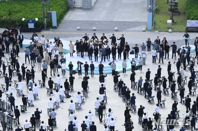 [광주=뉴시스]박영태 기자 = 문재인 대통령과 김정숙 여사가 18일 오전 광주광역시 동구 옛 전남도청 앞에서 열린 제40주년 5·18 민주화운동 기념식에 참석해 임을 위한 행진곡을 제창하고 있다. 2020.05.18.