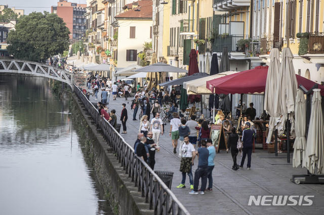 [밀라노=AP/뉴시스]18일(현지시간) 이탈리아 밀라노의 나빌리오 운하 일대에서 사람들이 산책을 하고 있다. 이탈리아는 이날부터 신종 코로나바이러스 감염증(코로나19) 억제를 위해 취한 봉쇄 조치를 추가로 완화해 대부분 상점과 음식점 영업 재개를 허용했다. 2020.5.19.