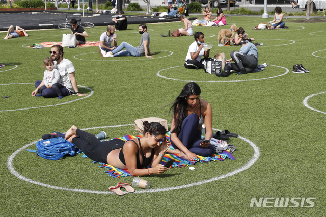 [뉴욕=AP/뉴시스]18일(현지시간) 미국 뉴욕의 브루클린 도미노 공원에서 시민들이 신종 코로나바이러스 감염증(코로나19) 예방을 위해 적절한 사회적 거리 두기가 표시된 원 안에 모여 휴식을 취하고 있다. 인구 과밀 지역이던 이곳에 방문객들의 코로나19 확산 예방 사회적 거리 두기 습관을 촉진하기 위한 원을 그려놓아 효과를 보고 있다. 2020.05.19.