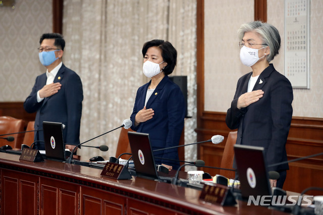 [서울=뉴시스]김병문 기자 = 19일 오전 서울 종로구 정부서울청사에서 열린 국무회의에 참석한 국무위원들이 국민의례를 하고 있다. 2020.05.19.