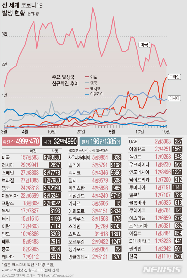 [서울=뉴시스]19일(현지시간) 브라질에서 컨트롤 타워 부재로 처음으로 코로나19 하루 사망자가 1000명을 넘어섰다.  (그래픽=안지혜 기자)