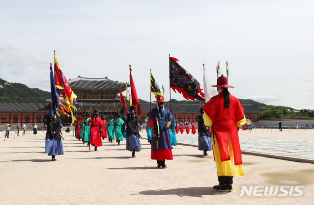 [서울=뉴시스]배훈식 기자 = 경복궁 수문군이 20일 오전 서울 종로구 경복궁에서 수문장 교대의식을 하고 있다. 문화재청 궁능유적본부는 지난 2월 신종 코로나바이러스 감염증(코로나19) 여파로 중단된 수문장 교대의식을 비롯한 경복궁 야간특별관람과 고궁 음악회 등 각종 궁궐행사들을 '생활 속 거리두기 전환'에 따라 이달부터 운영한다. 2020.05.20.