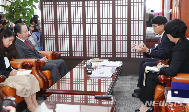[서울=뉴시스] 장세영 기자 = 윤상현 국회 외통위원장이 20일 서울 여의도 국회 외교통일위원장실에서 도미타 고지 주한 일본대사와 만나 발언을 하고 있다. 2020.05.20.