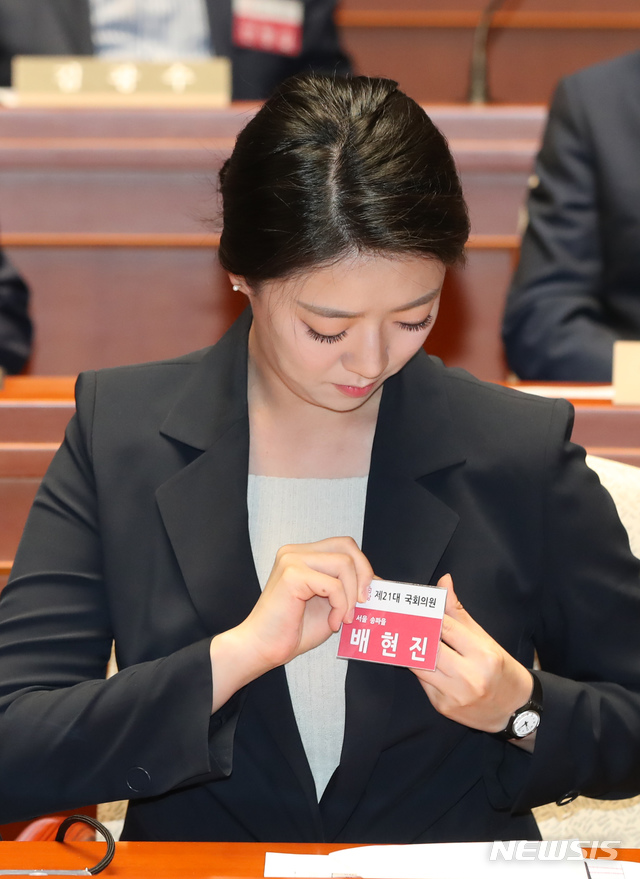 [서울=뉴시스] 고승민 기자 = 배현진 미래통합당 당선인이 21일 서울 여의도 국회에서 열린 당선인 워크숍에서 명찰을 달고 있다. 2020.05.21.