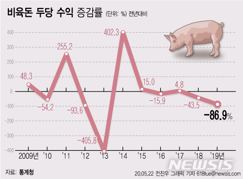 [서울=뉴시스] 22일 통계청에 따르면 지난해 비육돈(고기의 생산·판매를 목적으로 사육하는 돼지) 한 마리 당 순수익(총수입에서 사육비를 제외한 값)은 6000원으로, 1년 전(4만8000원)보다 -86.9% 감소했다. (그래픽=전진우 기자)