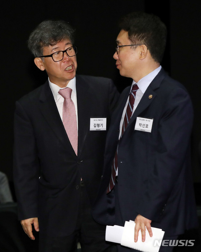 [서울=뉴시스] 박미소 기자 = 김형기(왼쪽) 뉴시스 대표이사 사장과 박선호 국토교통부 제1차관이 22일 오전 서울 중구 플라자호텔 그랜드볼룸에서 '코로나 이후 부동산 정책방향'이란 주제로 열린 제2회 뉴시스 건설부동산포럼 2020에서 대화를 나누고 있다. 2020.05.22.