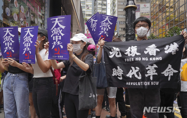[홍콩=AP/뉴시스] 홍콩 시내 중심가에서 24일 시위 참가자 수백명이 "광복 홍콩" "시대혁명"이라고 쓴 플래카드를 들고 중국의 홍콩 국가보안법 제정에 반대하는 시위를 벌이고 있다. 2020.05.24