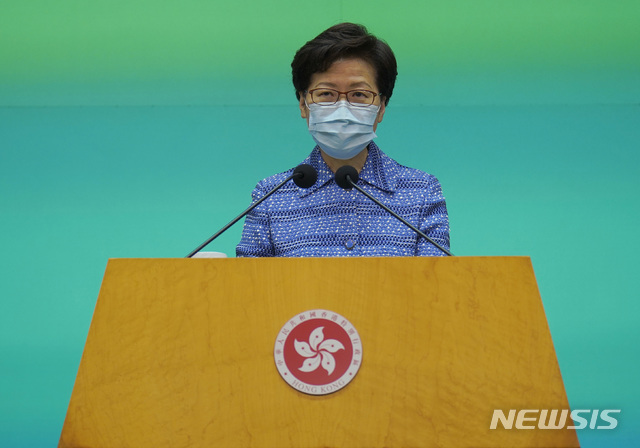 [홍콩=AP/뉴시스]캐리람 홍콩 행정장관이 26일(화) 홍콩에서 열린 기자회견 중 기자들의 질문을 듣고 있다. 캐리람 장관은 이 자리에서 중국이 홍콩에 부과할 새로운 국가보안법을 옹호하고 나섰다. 앞서 중국 전국인민대표대회에 제출된 홍콩 국가보안법은 홍콩 내 반역 및 내란 선동 등의 행위를 처벌하고 국가보안법 집행 기관을 설립하는 등의 내용을 담고 있어 이는 일국양제 원칙을 위반한 것이라는 비난을 받고 있다. 2020.05.26.