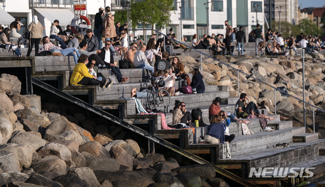 [말뫼(스웨덴)=AP/뉴시스]26일(현지시간) 스웨덴 말뫼에서 시민들이 따뜻한 저녁 날씨를 즐기며 나와 있다. 스웨덴은 신종 코로나바이러스 감염증(코로나19) 인구 10만 명당 약 38명의 사망자를 내 세계에서 가장 높은 사망률을 보임에도 집단 면역 대응을 옹호해 왔다. 집단 면역이 효과를 보려면 구성원 60% 이상이 항체를 보유해야 하나 수도 스톡홀름에서 코로나19 항체 보유 비율은 전체 인구의 7.3%로 추정돼 집단 면역 대응에 대한 비판이 커지고 있다. 스웨덴의 코로나19 누적 확진자 수는 3만4440명이고 사망자는 4125명이다. 2020.05.27.