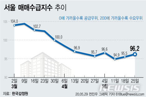 [서울=뉴시스] 29일 한국감정원에 따르면 이달 25일 기준 서울 아파트 주간 매매수급 지수는 96.2로 전주(95.5)보다 소폭 상승했다. 지난 11일 94.9를 저점으로 2주 연속 상승한 것이다. (그래픽=전진우 기자)
