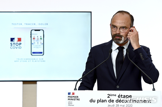 [파리=AP/뉴시스]에두아르 필리프 프랑스 총리가 28일(현지시간) 한 TV 방송에 출연해 신종 코로나바이러스 감염증(코로나19)에 따른 제한 조치를 완화 발표를 하고 있다. 필리프 총리는 내달 2일부터 음식점과 카페, 주점의 영업금지령을 풀고 100㎞ 이상 여행을 금지하는 조치도 해제한다고 밝혔다. 프랑스 국회의원들은 코로나19 확산을 막기 위해 고안된 프랑스의 접촉 추적 앱을 승인하기도 했다. 2020.05.29.