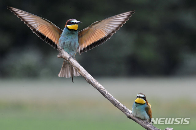 [티스잘파르(헝가리)=AP/뉴시스]27일(현지시간) 헝가리 티스잘파르(Tiszaalpar) 근처에서 한 쌍의 유럽 벌잡이 새 중 한 마리가 구애의 춤을 추고 있다. 이 벌잡이 새는 크기가 약 28cm로 유럽에서 가장 화려한 새 중 하나다. 2020.05.29.