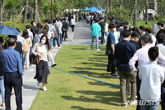 [서울=뉴시스] 이윤청 기자 = 29일 서울 중구 서소문역사공원에 마련된 임시 선별진료소에서 시민들이 신종 코로나바이러스 감염증(코로나19) 검사를 위해 대기하고 있다. 29일 중구에 따르면 서울 중구 센트럴플레이스 7층 KB생명보험 전화영업 대리점에서 코로나19 집단감염이 발생한 가운데 직원 117명 중 확진자 8명을 제외한 109명이 모두 음성 판정을 받았다. 2020.05.29.