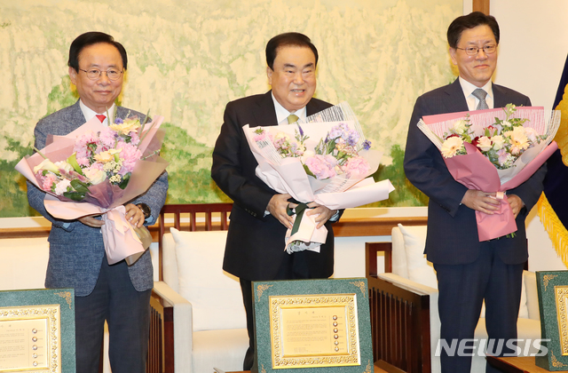 [서울=뉴시스]김명원 기자 = 문희상 국회의장과 이주영·주승용 국회부의장이 29일 오전 서울 여의도 국회의장접견실에서 열린 제20대 후반기 국회의장단 퇴임식에서 꽃다발을 받고 있다. 2020.05.29.