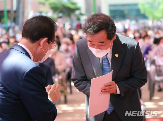 [서울=뉴시스] 전진환 기자 = 불기2564년 부처님오신날 법요식이 열린 30일 오전 서울 종로구 조계사에서 이낙연 더불어민주당 코로나19국난극복위원장과 박원순 서울시장이 인사하 있다. 2020.05.30.