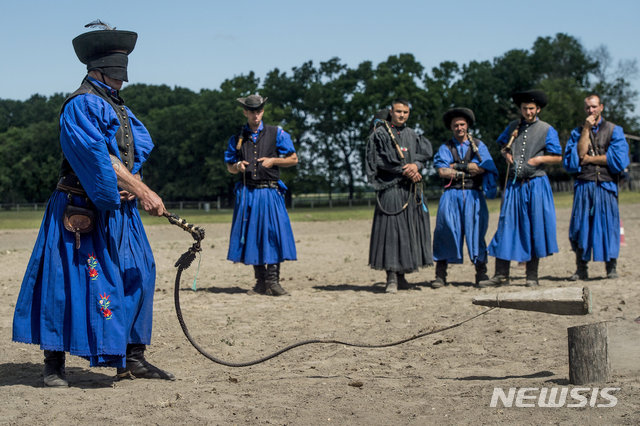 [솔트=AP/뉴시스]1일(현지시간) 헝가리 솔트에서 '오순절의 왕'을 뽑는 행사가 열려 한 남성이 눈을 가린 채 그루터기에 놓인 나무 조각을 가죽 채찍으로 내려치고 있다. 중세시대부터 이어오는 이 행사는 마을의 젊은 남성들이 다양한 기량을 선보여 우승을 다투며 우승자는 젊은이들의 지도자가 되고 지역 술집에서 1년간 무료로 술을 마시는 특권이 주어지는 풍습이 있다. 2020.06.02.