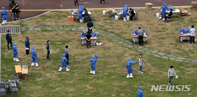 [인천=뉴시스] 이종철 기자 = 인천시 부평구청에서 신종 코로나바이러스 감염증(코로나19) 확진자가 발생한 2일 오후 부평구청 광장에 설치된 임시 선별진료소에서 공무원들이 '워크스루’ 방식으로 검사를 받고 있다. 2020.06.02.
