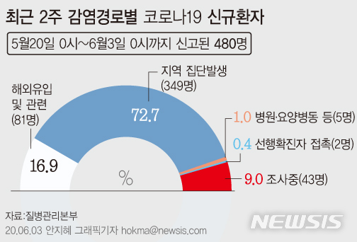 [서울=뉴시스]지난달 20일 오전 0시부터 2주간 신고된 코로나19 신규 환자는 총 480명이다. 이중 감염 경로가 불분명해 조사중인 사례는 43명으로 약 9.0%다. (그래픽=안지혜 기자)