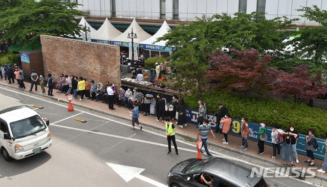 [수원=뉴시스] 김종택기자 = 3일 오전 경기 수원시 팔달구 한 아울렛 매장에서 열린 영업종료 고별대처분 행사에 많은 인파들이 몰려 입장을 기다리고 있다. 2020.06.03.