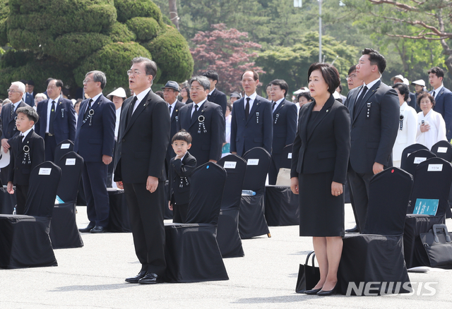 [대전=뉴시스]배훈식 기자 = 문재인 대통령과 김정숙 여사가 6일 대전 유성구 국립대전현충원에서 열린 제65회 현충일 추념식에 참석해 애국가를 제창하고 있다. 2020.06.06.