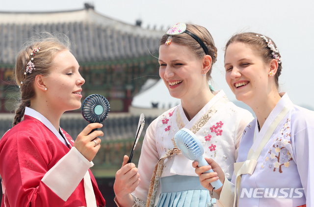 [서울=뉴시스] 고승민 기자 = 서울 기온이 31도를 기록하는 등 더운 날씨를 보인 6일 서울 경복궁 광화문을 찾은 외국인들이 한복을 입고 부채와 손선풍기로 더위를 식히며 대화를 나누고 있다. 2020.06.06.