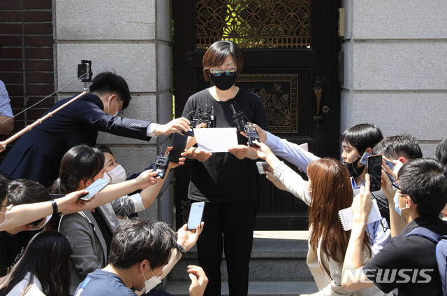 [서울=뉴시스] 박민석 기자 = 이나영 정의기억연대 이사장이 7일 오후 서울 마포구 일본군 ‘위안부’ 피해자 쉼터 평화의 우리집 앞에서 소장의 사망과 관련한 입장 발표를 하고 있다. 평화의 우리집 소장 A씨는 지난 6일 오후 경기 파주시 자택에서 숨진 채 발견됐다. 2020.06.07.