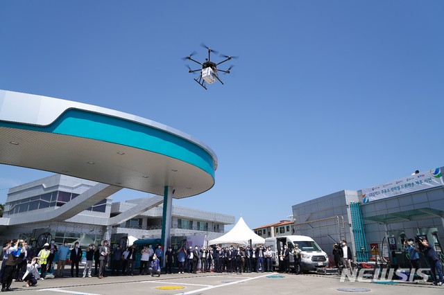 [제주=뉴시스] 강정만 기자= 제주시 해안초 학생들에게 샌드위치를 배달하기 위해 비행 준비를 마친 드론이 8일 오전 제주시 무수천 주유소에서 힘차게 날아오르고 있다 (사진=제주도 제공) 2020.06.08