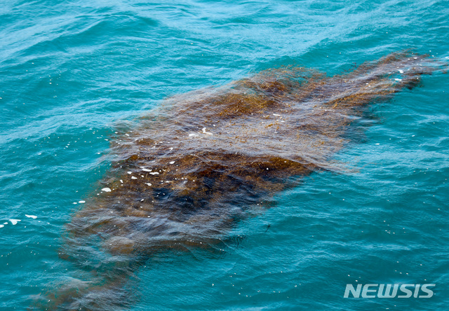 [제주=뉴시스]우장호 기자 = 8일 제주시 북부 해상에서 황갈색 괭생이 모자반이 해류를 타고 해안가 등 연안으로 떠내려가고 있다 .제주도는 국립수산과학원 등과 공동 조사한 결과 괭생이 모자반이 동중국해에서 밀려온 것으로 보고 있다. 괭생이모자반은 해안가로 밀려와 경관을 훼손하고 악취를 풍겨 민원을 야기할 뿐 아니라 양식장, 어선 등 그물이나 시설물에 달라붙어 어업 활동에 지장을 주는 것으로 알려져 있다. 2020.06.08.
