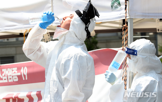 [인천=뉴시스] 이종철 기자 = 신종 코로나바이러스 감염증(코로나19)의 집단감염이 확산되고 무더운 날씨를 보인 8일 오후 인천시 부평구 가톨릭대학교 인천성모병원 선별진료소에서 근무교대를 한 의료진이 냉수를 마시며 더위를 식히고 있다. 2020.06.08.
