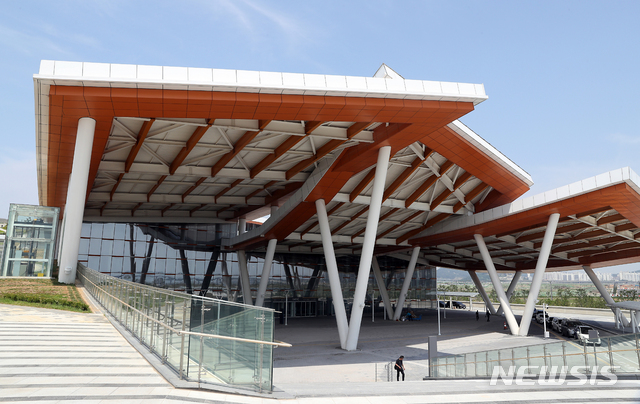 [인천=뉴시스] 이종철 기자 = 9일 오후 인천시 연수구 신국제여객터미널이 위용을 뽐내고 있다. 이 터미널은 경제자유구역인 송도국제도시 9공구 바닷가에 아파트 9층 높이(36m), 축구장 9개를 합친 넓이(연면적 6만6천805㎡)의 대형 건축물로 세워졌으며 이달 15일 개장을 앞두고 있다. 2020.06.09.