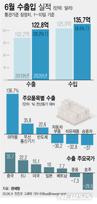 [그래픽]6월 수·출입 모두 상승세…의약품 수출 급증속 반도체도 활발