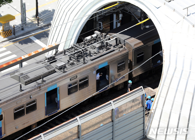 [서울=뉴시스] 이윤청 기자 = 서울교통공사 관계자들이 11일 서울 노원구 상계역에서 열차 복구작업을 하고 있다. 11일 오전 10시43분께 상계역에 멈춰있던 코레일 열차를 창동차량기지로 회송중이던 서울교통공사 열차가 추돌해 양방향(노원↔당고개) 운행이 중단됐다. 2020.06.11.