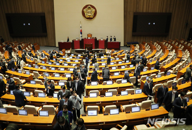 [서울=뉴시스] 김진아 기자 = 더불어민주당 의원 등이 2일 서울 여의도 국회에서 열린 본회의가 산회되자 본회의장을 나서고 있다. 2020.06.12.