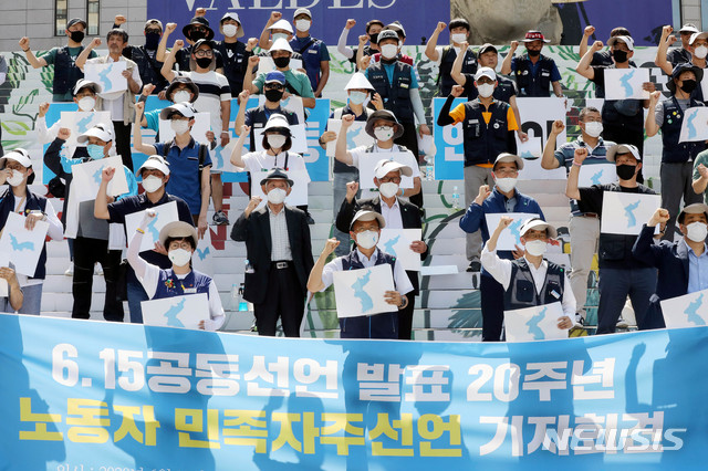 [서울=뉴시스]김병문 기자 = 민주노총과 한국노총 조합원들이 13일 오후 서울 종로구 세종문화회관 계단에서 열린 '6.15공동선언 발표 20주년 노동자 민족자주선언 기자회견'에 참석해 구호를 외치고 있다. 2020.06.13.
