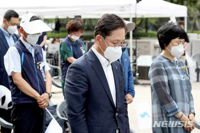 [서울=뉴시스]김병문 기자 = 배진교 정의당 원내대표가 13일 오후 서울 중구 청계천 인근에서 열린 '6.15 공동선언 발표 20주년 평화통일대회'에 참석해 묵념하고 있다. 2020.06.13.