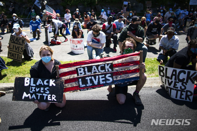 [웨스트포인트=AP/뉴시스]도널드 트럼프 대통령이 13일(현지시간) 미 뉴욕주 웨스트포인트에서 열린 육군사관학교 졸업식에 참석한 가운데 웨스트포인트 주민들이 경찰의 과잉 진압으로 숨진 흑인 남성 조지 플로이드 죽음에 연대 시위를 하고 있다. 2020.06.14.