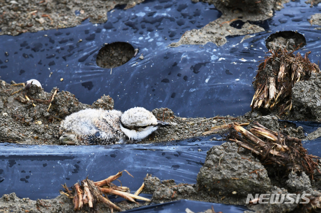[함안=뉴시스]차용현 기자 = 14일 오후 경남 함안군 인근 들녘에서 인기척에 놀란 멸종위기 2급 흰목물떼새 새끼 한 마리가 몸을 땅 바닥에 붙인 채 숨을 죽이고 있다. 2020.06.14.