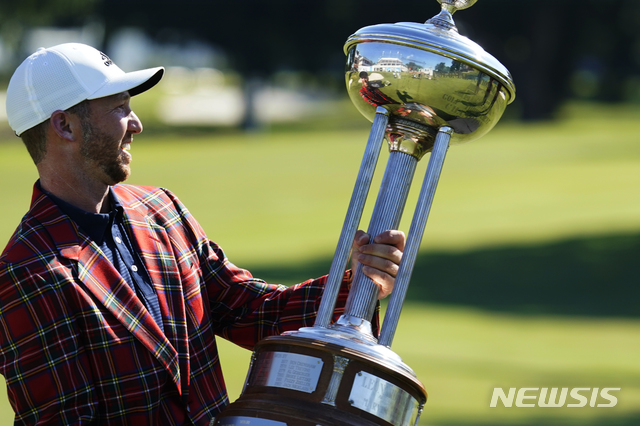 [포트워스=AP/뉴시스]대니얼 버거(미국)가 14일(현지시간) 미 텍사스주 포트워스의 콜로니얼 골프클럽에서 열린 미 프로골프(PGA)투어 찰스 슈왑 챌린지에서 우승 후 트로피를 들고 포즈를 취하고 있다. 버거는 최종합계 15언더파 265타로 콜린 모리카(미국)와 동타를 이뤄 연장 끝에 우승했다. 2020.06.15.