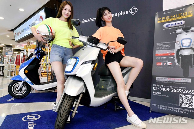 [서울=뉴시스]15일 서울 등촌동 홈플러스 강서점에서 모델들이 대림오토바이의 전기 스쿠터를 선보이고 있다. 홈플러스는 대림오토바이와 협업을 통해 전기 스쿠터 재피, 재피 플러스, EM-1 모델을 판매한다. (사진=홈플러스 제공) 2020.06.15.