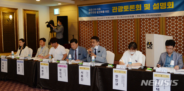 [전주=뉴시스] 김얼 기자 = 코로나19 이후 전주 관광 활성화를 위한 '관광토론회 및 설명회가 열린 16일 전북 전주시 풍남관광호텔 풍남홀에서 장인식(가운데, 한국관광학회 부회장) 좌장과 토론자들이 진지한 모습으로 토론을 이어가고 있다. 2020.06.16.