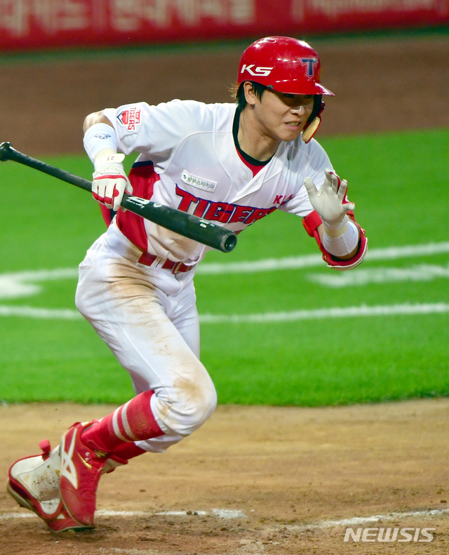 [광주=뉴시스] 류형근 기자 = 16일 오후 광주 북구 광주-기아챔피언스필드에서 열린 2020프로야구 KIA 타이거즈 대 NC 다이노스의 경기, 8회말 무사 1, 2루에서 KIA 9번타자 박찬호가 번트를 한 뒤 전력질주 하고 있다. 2020.06.16.