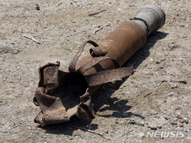 [연평도=뉴시스]최진석 기자 = 21일 인천시 옹진군 연평도에서 2010년 북한의 포격 당시 연평도에 떨어진 포탄이 취재진에게 공개되고 있다.2020.06.21.