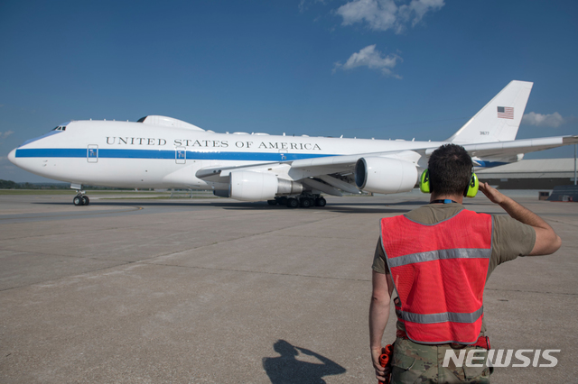 [서울=뉴시스]미군 전략사령부가 20일 트위터에 핵공중지휘통제기 E-4B 훈련 모습을 공개했다. '나이트워치' 또는 '심판의 날 항공기(the doomsday plane)'이란 이름으로도 불리는 E-4B는 핵전쟁 시 공중에서 전쟁을 지휘하기 위한 목적의 항공 지휘관제소이다. (사진=미 전략사령부 트위터) 2020.06.22.