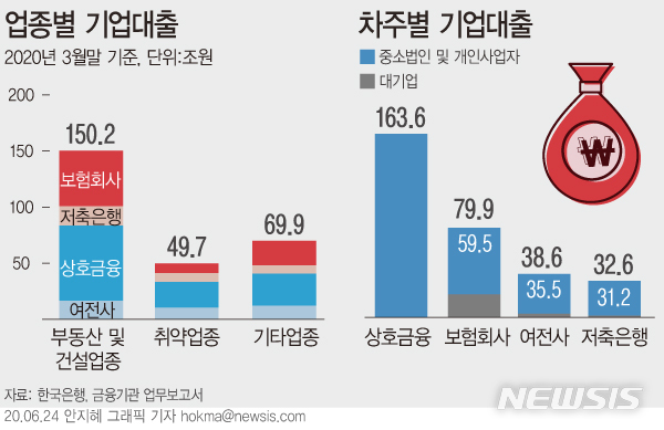 [서울=뉴시스]한국은행에 따르면 지난 3월말 기준 비은행금융기관의 기업대출은 321조7000억원으로, 업종별로는 부동산업 및 건설업종 비중(55.6%)이 높았다. (그래픽=안지혜 기자)