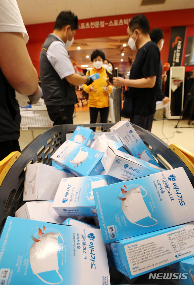 [서울=뉴시스]김병문 기자 = 24일 오후 서울 성동구 이마트 성수점에서 비말 차단용 마스크를 구매하려는 시민들이 번호표와 마스크를 맞바꾸고 있다. 2020.06.24. [email protected]