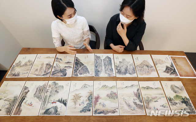 [서울=뉴시스] 고승민 기자 = 25일 서울 케이옥션에서 열린 7월 경매 출품작 보물 겸재 화첩 설명회에서 관계자들이 화첩 사본을 펼쳐 설명하고 있다. 화첩의 정식 명칭은 '정선필 해악팔경 및 송유팔현도 화첩'이다. 국가지정 문화재 보물 제1796호이며, 추정가 50-70억원으로 이번 경매에서 낙찰되면 국내 고미술 경매사상 최고가를 경신한다. 2020.06.25.
