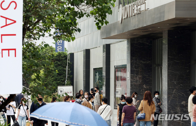 [인천=뉴시스] 이종철 기자 = 대한민국 동행세일이 시작된 26일 오전 인천시 미추홀구 롯데백화점 인천터미널점에서 시민들이 백화점 개점 시간을 기다리고 있다. 2020.06.26.