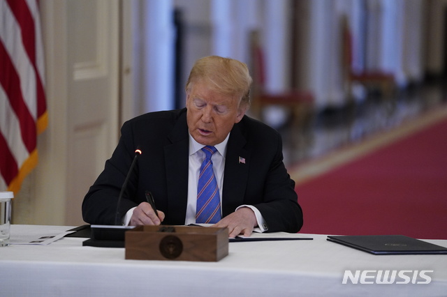[워싱턴=AP/뉴시스]도널드 트럼프 대통령이 26일(현지시간) 백악관 이스트룸에서 미국 노동정책자문위원회와 회담하는 자리에서 행정명령에 서명하고 있다. 이 행정명령은 연방 정부 공무원 채용 시 학위보다 직무 능력을 우선하는 것을 골자로 한다. 2020.06.27.