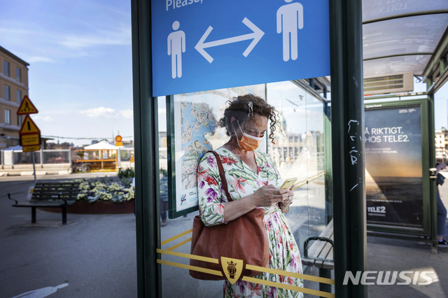 [스톡홀름=AP/뉴시스]26일(현지시간) 스웨덴 스톡홀름의 마스크를 쓴 한 여성이 사회적 거리 두기를 권장하는 한 버스 정류소에 서 있다. 신종 코로나바이러스 감염증(코로나19) 예방을 위한 마스크 착용의 이점이 없다는 태도를 보여온 스웨덴 국립보건원 감염병 학자 안데르스 텡넬은 어쩌면 사람들에게 입과 코를 가릴 것을 권장할 상황이 있을 수도 있다고 말했다. 스웨덴의 코로나19 누적 확진자 수는 6만5137명, 사망자는 5280명이다. 2020.06.27.